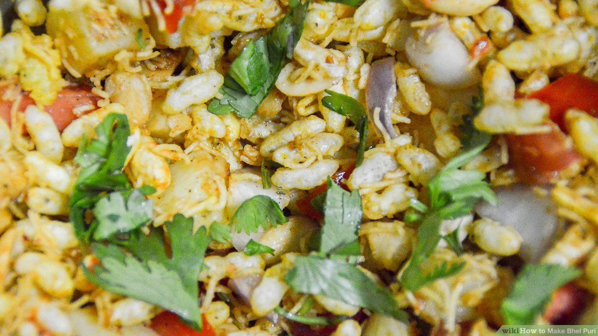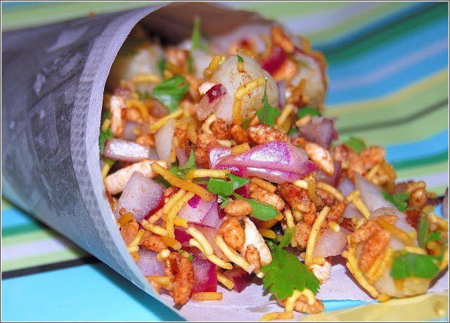 Bhel puri is made from puffed rice and sev a fried snack shaped like thin noodles made from besan flour mixed with potatoes, onions, chat masala and chutney and a mixture of other fried snacks as the base of the snack.